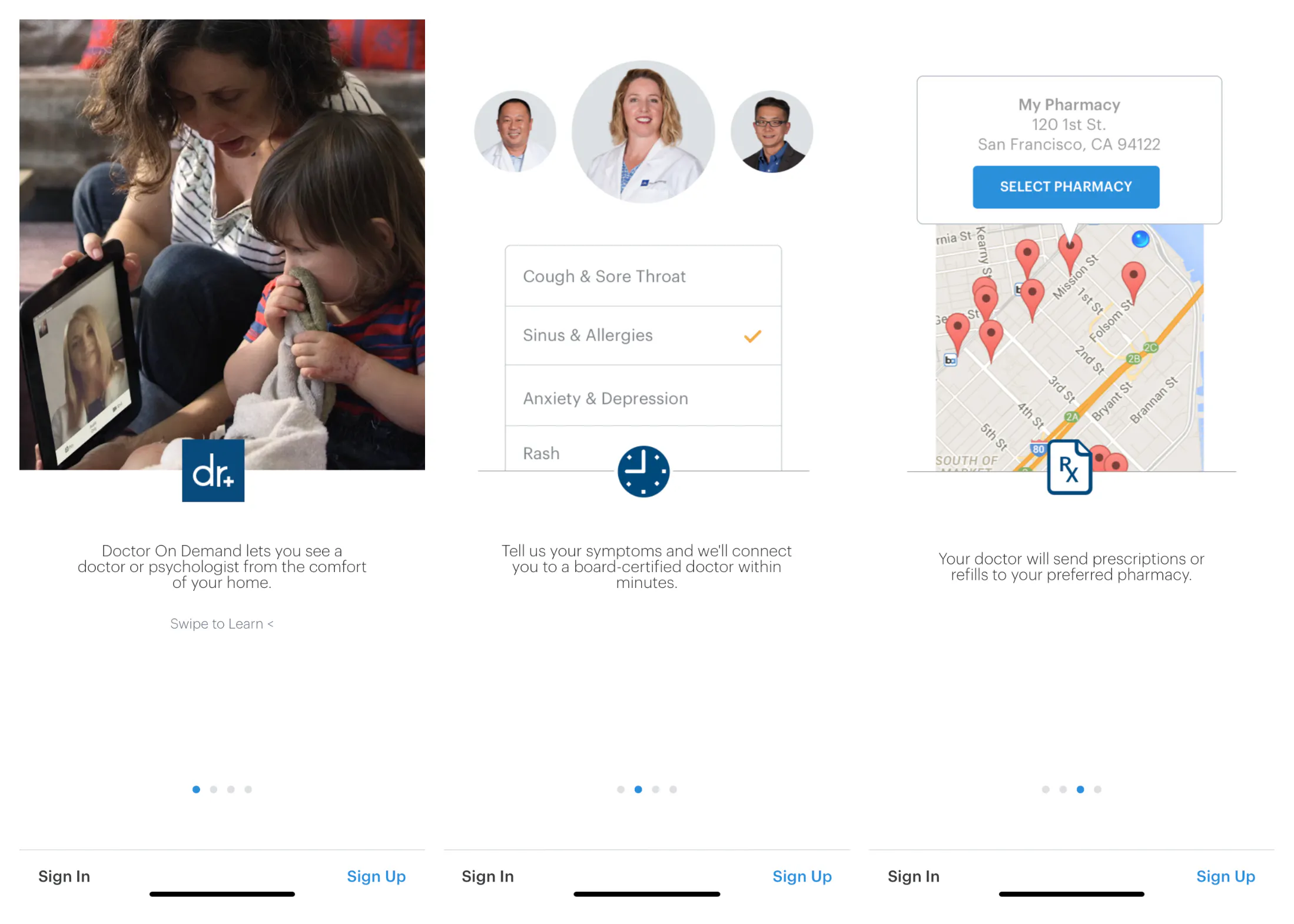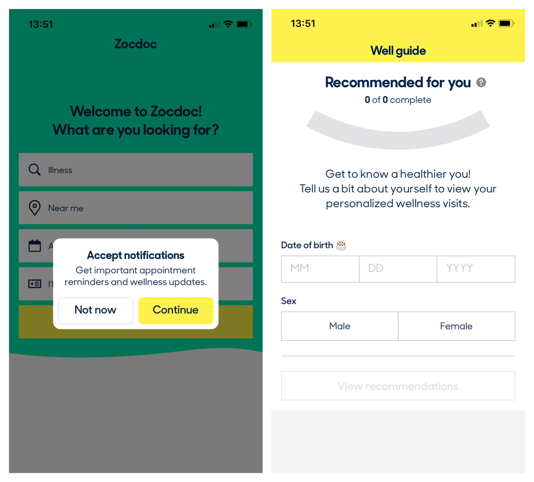 Let's look closer at two popular appointment applications: Doctor On Demand and Zocdoc. They approach onboarding differently. The former offers several screens for users to learn what to expect and right after that asks them to register. The latter, on the other hand, doesn't give general information and allows users to browse the app without registering.